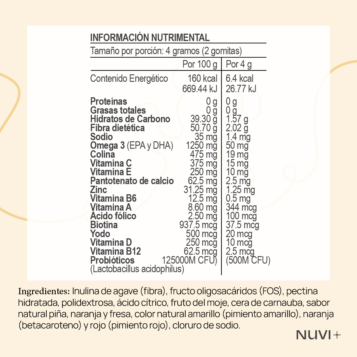 - Cada frasco incluye 90 gomitas de 2 gramos cada uno, sabor tutti frutti (piña, naranja y fresa).