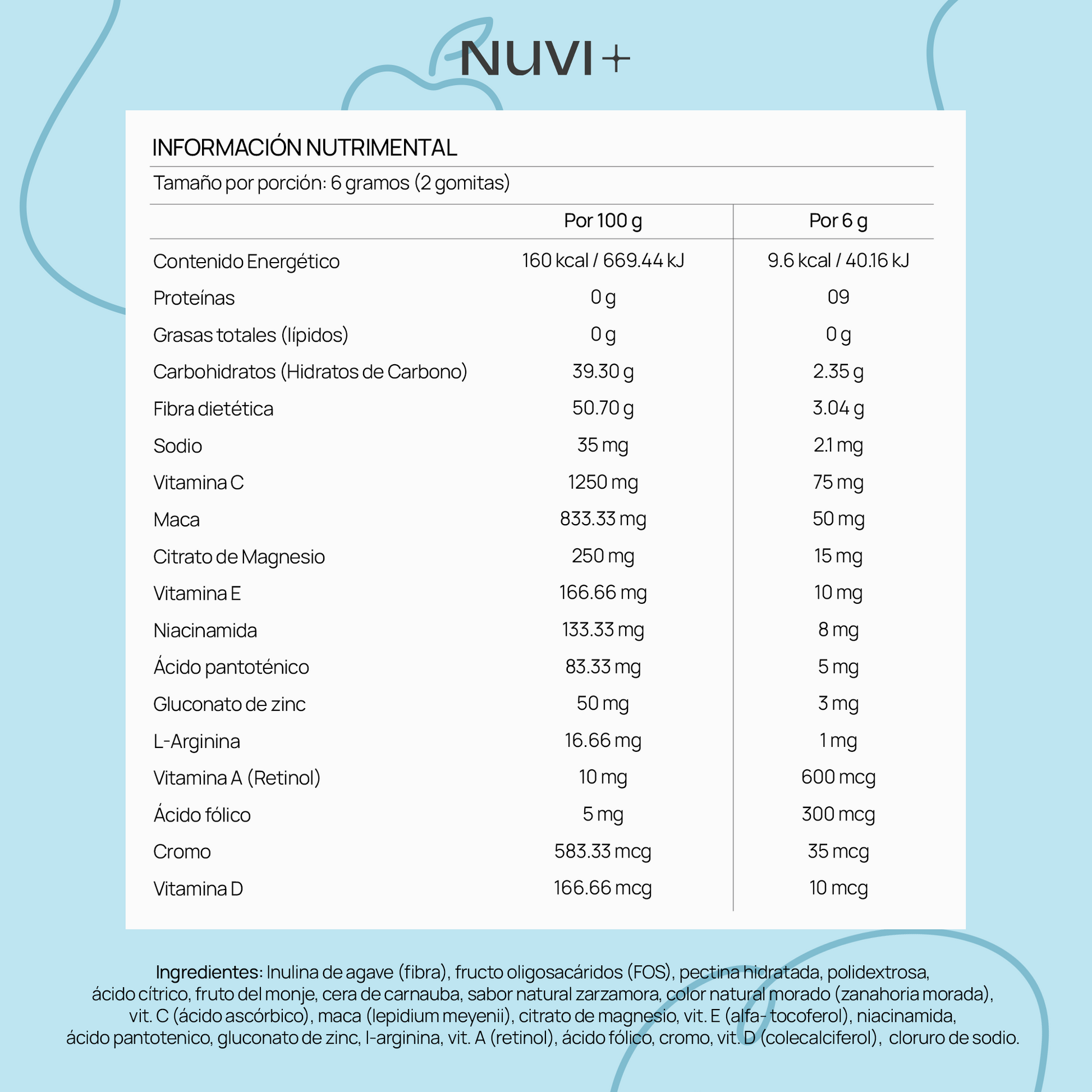 - Suplemento alimenticio en forma de gomita 100% vegano, sin azúcar añadida, con colorantes y saborizantes 100% naturales, sin OMG (organismos modificados genéticamente), sin gluten y endulzado con fruto del monje.